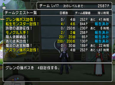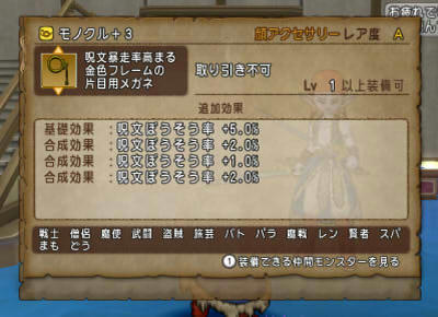 最近体調が悪くて… ドラクエもそこそこに早めに寝るようにしておりました いろいろあったこと ------------------------------------------------------------------------------------ カード期限が近かったので、二人でヒドラ 死にました このあと、フレンドさんに付き合っていただきまして、いっぱいカケラゲットしました ------------------------------------------------------------------------------------ サブのプチバズズが2枚 1枚期限切れたので捨てたら、期限の残ってるほうを捨ててました 次ログインしたときに、「期限切れたよ!」ってメッセージが出てきて 「???」ってなりました とほほ ------------------------------------------------------------------------------------ 魚釣ってます セドレの近くでニシキゴイ 今釣った魚が49種になりました あと1種…!がなかなか レベルが16になって、依頼がちょっといいのになったのが嬉しいです( ´∀`) ------------------------------------------------------------------------------------ んで、ストーリーも進めてます ボスが…エレメント軍団が…倒せないよ…!! PR 2014.08.22 Fri 23:51:07 転生にあおうえるこのお尻をめでる この日、チムクエが 転生×4 モノクル×2 で経験値 1000 オーバー やるっきゃないよ!!! すばるが当てた奇跡の香水を入れ、いざポポリアへ メンバーは ナオ君(盗賊)・タマモ(魔戦)・れき(僧侶)・すばる(盗賊) 盗む気まんまんです いつもいく、奥のとこに人がいて、ふらふらふらふら探し歩き… なんとか遭遇できました モノクル×2 そのあとナオ君がちからの指輪ほしいって 地獄のドアボーイを探し、 偽デフェルへ 倒せる自信は皆無だったので、エンカウントしては逃げるという、 オーガキング、ストレスフルなことをしてきました 出ず 結果、転生×4が達成できず… 夜 すばると二人で再度転生ツアーへ 今回はドロップより、たくさん会うことを目的に… まずはツスクルで 大ナスビナーラ でかい!かわいい!! そこからレーナム緑野へ つむりんママ メタルホイミン を狙うものの出ず… レッドアーチャーには会えました 次はグレン西 シールドあにき 被りすぎ… 聖銀のどくろあらい この辺、さくっと出てうれしかったです^^ カミハルムイ南 マッドスミス アルケミストンは出ませんでした… 計5匹! 無事チムクエ達成~ ちなみにモノクルの合成 すばるが10%w ストレートでこうなるとは… つきやすいものなのかな 魔法使いレベル1なんだけどな 1%付け直すか悩みますが、このままでいいかなと思って モノクルが一個あまりました 現在すばるが育成中のスライムに装備させようかなと思ってます~ れきはたしか攻魔とかだったと思う… 2014.08.17 Sun 00:25:02 釣り 50種を目指してナオ君ちの前で釣り中 釣った魚が50種になると、さかな袋が拡張されると知り、釣りに勤しんでいます まだ見ぬ大物を求め、東奔西走 いろいろ釣ってきました 黒鯉 金鯉 色が変わっただけで、寸分たがわない カミハルムイ南の丸い池でつれました 大物!マグロです シエラでつれました ここではまだ釣ったことのなかった、フグも釣れました^^ スズキ ホオジロザメ! 偽グランゼドーラの北端で すばるも釣れました~ というか、れきにもかかることはかかるんですが、釣りあげられず… すばるが5匹釣ってる間にやっと1匹釣りあげました(´;ω;`) 二人とも氷改竿に、天使ルアー ですが、すばるは両方★2なんですよね… れきは★1 星の大事さが身に染みました… でもサブに作らせてるもんだから、うまくできなきゃ星なしもやむなし… これでれきが釣った魚は43種になりました★ あとはニシキゴイとか…ゴクラクギョ白とか… 大物がいろいろ残っているので、またチャレンジしなきゃな~ 2014.08.10 Sun 11:01:53 20140810れき